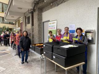 我們於安蔭邨派發龍母廟捐贈的生果。